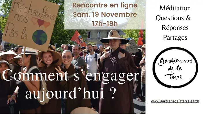 Cette interrogation répond à notre besoin d’approfondir ce qu’est le Bouddhisme Engagé que nous propose notre cher Maître Thich Nhat Hanh, en écho avec nos aspirations. Ainsi, nous aimerions explorer ces questions avec vous et vous offrir cet espace pour formuler les questions présentes à votre cœur sur ce thème. Pour ce « Questions/Réponses », nous aurons le plaisir de recevoir aux côtés de nos ami.es monastiques, Jean-Louis Girard, président de l’association St Hugues de Biviers, centre spirituel catholique situé dans la montagne près de Grenoble, dont les valeurs sont l'écoute, la simplicité, la conversion écologique, le partage, le silence et l’intériorité, et Christine Kristof, spécialiste des questions écologiques, co-fondatrice du Mouvement Chrétien "Unis pour la Terre", du Réseau des Écosites Sacrés et de l’association AnimaTerra dont l’objectif est de favoriser le lien à la nature qui nous habite et que nous habitons et de sensibiliser à une approche spirituelle de l’écologie. Cette soirée, essentiellement centrée sur les « Questions/Réponses », avec un moment de partage en grand groupe vers la fin, sera l’occasion de poursuivre les échanges et d’ouvrir notre questionnement à d’autres communautés. Alors, faites un nœud à votre mouchoir et rejoignez-nous le 19 novembre de 17h à 19h, notre heure d’hiver Voici le lien pour nous rejoindre avec Zoom, le samedi 17/09 à 17h Participation libre, sans inscriptionhttps://plumvillage.zoom.us/j/91753474753?pwd=Rmh1V1BHOXJPKytxK0hSTlVMTHhjZz09 ID de réunion : 917 5347 4753 Code secret : 013866
